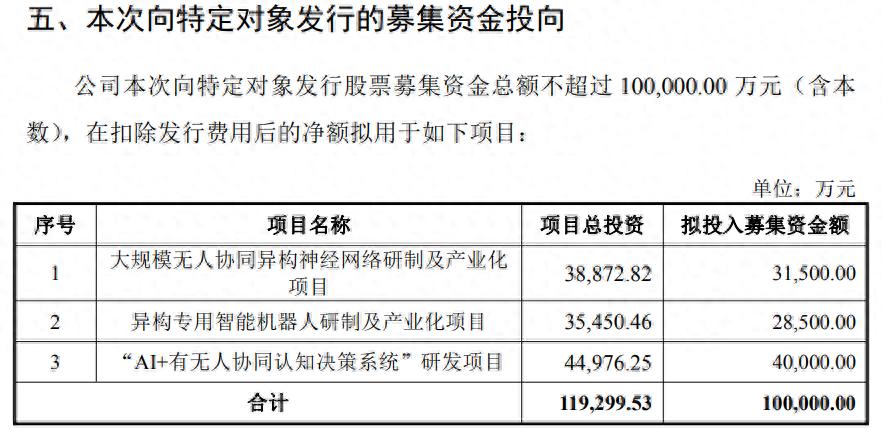预案称,本次定增有四大目的,一是在政策机遇期不断深化产业布局,推动公司发展战略的有效落地;二是布局无人集群神经网络的研制及节点产品开发,深化产业布局,创造新利润增长点;三是打造新质战斗力的关键产品,拓展主营业务广度,提升公司竞争实力;四是提升公司未来盈利水平,对军工行业未来发展趋势进行前瞻性的人才和技术储备。