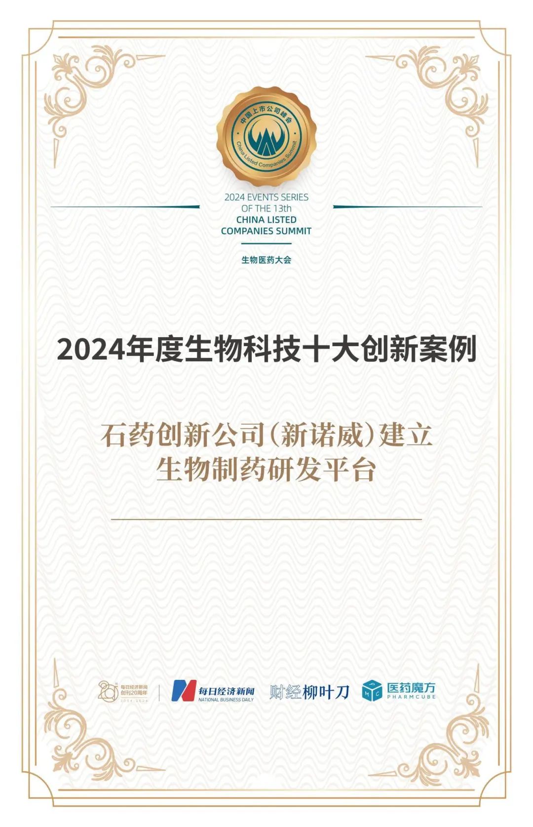 12月6日,“2024年度医药科技十大创新案例”在“2024生物医药大会”上正式揭晓,“石药创新(新诺威)生物制药研发平台建立”荣登案例榜单。