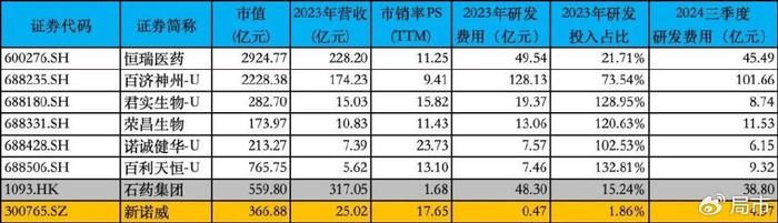 2024年上半年,恒瑞医药来自创新药的销售额66亿元,占营收比例约49%;百利天恒(688506.SZ)创新药商业拓展收入53.32亿元,占比95%;百济神州、君实生物(688180.SZ)、荣昌生物(688331.SZ)、诺诚健华等上市公司创新药销售占比均为100%。