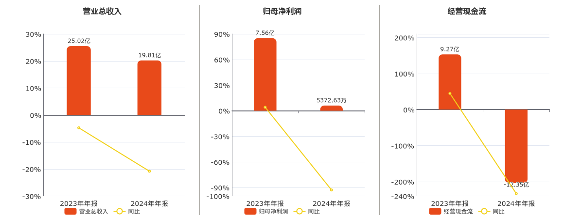公司营业总收入为19.81亿元,较去年同报告期营业总收入减少5.58亿元,同比较去年同期下降21.98%。归母净利润为5372.63万元,较去年同报告期归母净利润减少3.81亿元,同比较去年同期下降87.63%。经营活动现金净流入为-12.35亿元,较去年同报告期经营活动现金净流入减少19.56亿元,同比较去年同期下降271.26%。