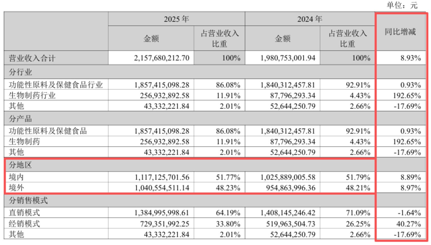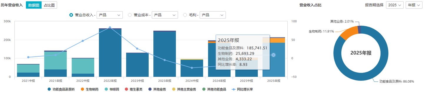 2025年功能性原料及保健食品收入占总营收的86.08%,仍是公司绝对的收入支柱,但0.93%的同比增速、11.39%的毛利额下滑,暴露了传统业务的增长瓶颈。