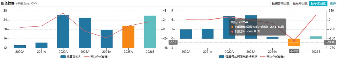 但利润端出现断崖式下滑,归母净利润从2024年盈利5372.63万元转为亏损2.41亿元;2022年与2023年,公司分别盈利7.26亿元、7.56亿元,2025年加权平均净资产收益率降至-6.96%,盈利能力大幅削弱。