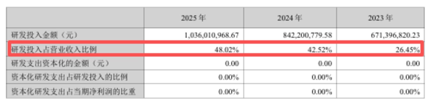 2025年公司研发投入高达10.36亿元,同比增加1.94亿元,增幅达23%,研发投入占营业收入的比例高达48.02%,远超行业平均水平。