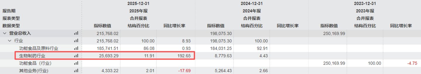 创新生物药的收入则开启高速增长,2025年公司生物制药业务收入达2.57亿元,同比暴涨192.65%,成为营收增长的动力源。