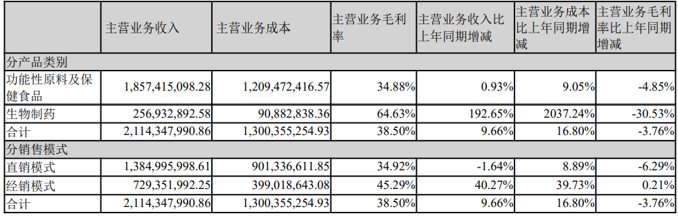 2025年功能性原料及保健食品业务毛利率34.88%,受市场因素影响,咖啡因类产品毛利率及盈利水平较上年同期有所下降,同比下降4.85%。从最近三年历史数据来看,2023年功能性原料及保健食品业务营收为24.49亿,毛利润率45.48%;2024年营收为18.4亿,毛利润率下降到39.73%%。板块营收规模和毛利率逐年下降,这也是公司积极进军生物制药领域的重要原因之一。