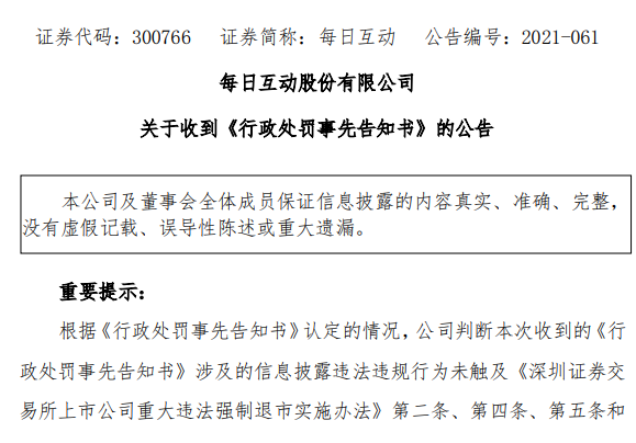 每日互动成立于2010年12月,于2019年3月25日成功在深交所创业板上市,主要提供数据智能服务。依据此次告知书认定情况,公司涉及的信息披露违法违规行为并未触及重大违法强制退市的情形,且上述事项未对每日互动公司生产经营造成其他影响。