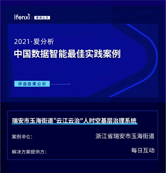 近日,“2021爱分析·中国数据智能最佳实践案例”评选征集活动落下帷幕。该评选活动由中国领先的产业数字化研究与咨询机构爱分析举办,面向金融、制造、能源、智慧城市等行业,围绕领先性、创新性、成熟度、价值创造四个维度评选出17个最佳实践案例。数据智能A股上市企业每日互动(维权)(股票代码:300766)公共服务面向基层治理打造的“瑞安市玉海街道‘云江云治’人时空基层治理系统”案例,从百余个参选案例中脱颖而出,入选中国数据智能最佳实践案例。
