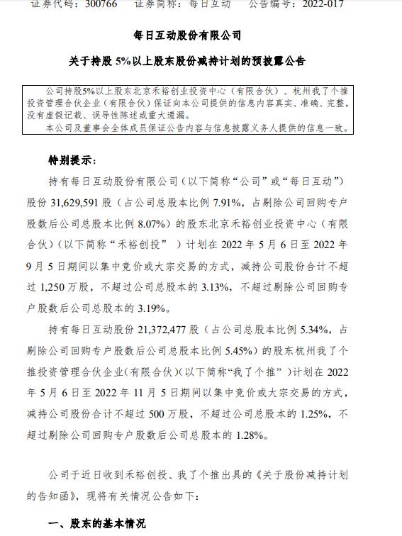4月11日,每日互动公告称,北京禾裕创业投资中心(有限合伙)计划在2022年5月6日至2022年9月5日期间以集中竞价或大宗交易的方式,减持公司股份合计不超过1250万股,不超过公司总股本的3.13%;杭州我了个推投资管理合伙企业(有限合伙)计划在2022年5月6日至2022年11月5日期间以集中竞价或大宗交易的方式,减持公司股份合计不超过500万股,不超过公司总股本的1.25%。