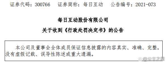 每日互动(300766)因未及时发现合同及业务虚假,对相关销售收入进行了确认并据此编制财务报表,导致其披露的 2019年三季报、2019 年年报、2020年一季报、2020 年半年报、2020 年三季报存在虚假记载,公司已于2021年10月19日公告收到中国证监会浙江证监局出具的《行政处罚决定书》(〔2021〕19号)。上海“公义之星”提示:凡在2019年10月28日(含)至2020年12月14日(含)期间以公开竞价方式买入,且在2020年12月14日闭市后仍持有股票的受损投资者可关注索赔。股票索赔的是历史法定损失金额,与目前是否持有股票没有任何关系。