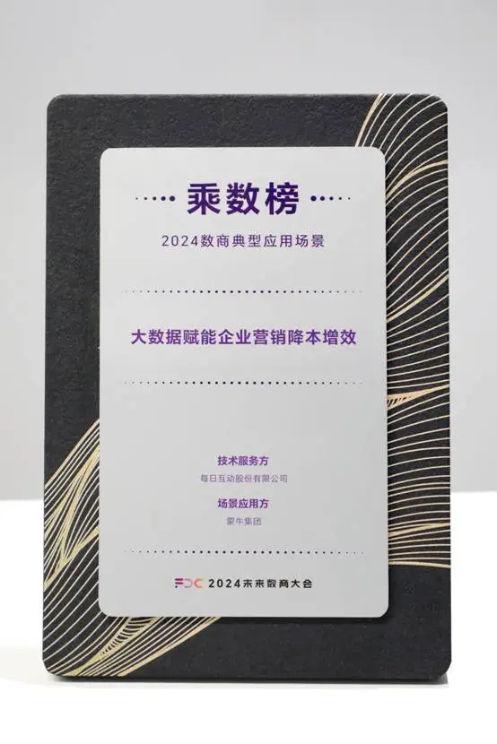"2024数商典型应用场景'乘数榜'"由2024未来数商大会组委向社会公开征集,并结合"含新量、含数量、含金量"三维模型与专家意见评选而成,面向商贸流通、交通运输、企业服务等13个领域,致力于发掘以场景需求为牵引、探索数据要素价值释放的优秀应用案例。每日互动与蒙牛集团合作的「大数据赋能企业营销降本增效」案例脱颖而出,成为最具代表性的应用场景之一。