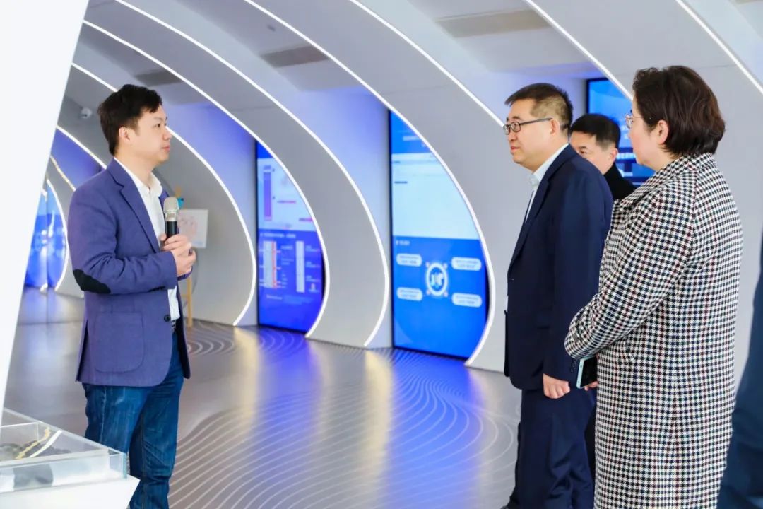 ▲每日互动方毅(左一)向张雁云(左二)一行介绍每日互动数据智能业务