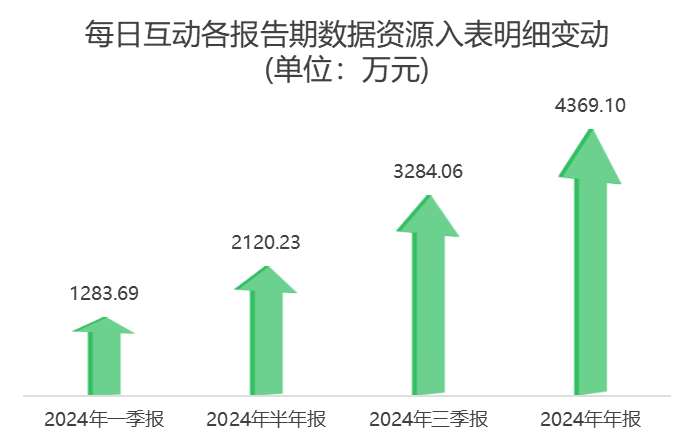 A股2024年报季,“国内数据智能第一股”每日互动(300766.SZ)继续稳步入表数据资源,截至报告期末入表数据资源4369.1万元,全部计入了无形资产科目。报告显示,2024年每日互动来自于数据要素价值化的收入已占比约87.58%。