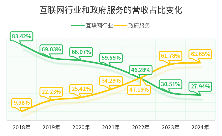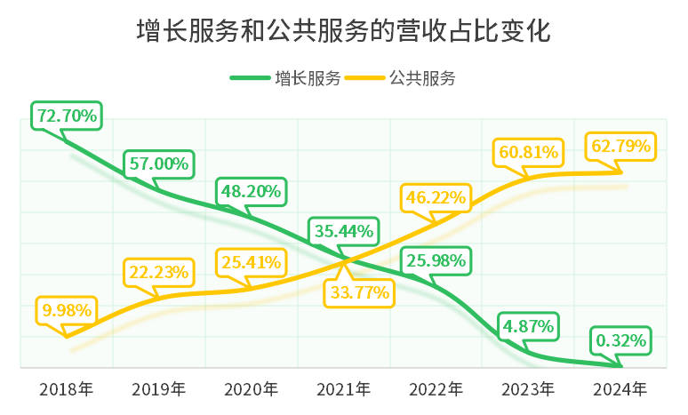 从财报来看,每日互动的主营业务也已转型至数据要素赛道。截至报告期末,分行业来看,来自互联网行业的收入占营业收入的比重为27.94%,来自政府服务的收入占比则达到了63.65%。分产品来看,公共服务的营收也占到了总营收的62.79%;而曾经的营收主力增长服务,2024年营收占比仅有0.32%。事实上,自每日互动上市的五年以来,政府服务的营收占比一直在高速增长,而互联网行业的营收占比则在不断收缩。