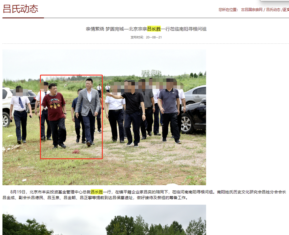 《红周刊》在调查过程中发现,此次风暴的关键人物——河南新财富集团的董事长、实控人吕弈在事件爆雷前已经“跑路”,尽管官方确定新财富集团、吕弈为罪魁祸首,但吕弈的去向仍不明,且外界对吕弈的了解也相当有限。从公开资料来看,吕弈除了涉及多宗经济纠纷诉讼案外,极少出现在公开报道中,惟一一次以正面形象出现还是在2020年8月,彼时其参与河南南阳的一次吕氏寻根问祖活动——“北京市丰实投资基金管理中心总裁吕长胜一行,在镇平籍企业家吕弈的陪同下,莅临河南南阳寻根问祖”,“吕长胜、吕弈等宗亲肃立吕侯墓前敬香三炷”。从公开照片来看,“二吕”搂着肩膀,神态放松。