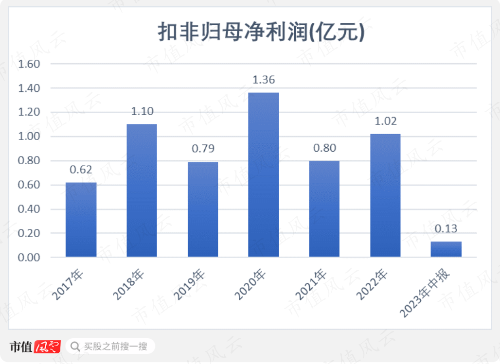 与营收变动不同,扣非归母净利润起起落落,2020年达到近几年的峰值1.36亿,2022年降至1.02亿。