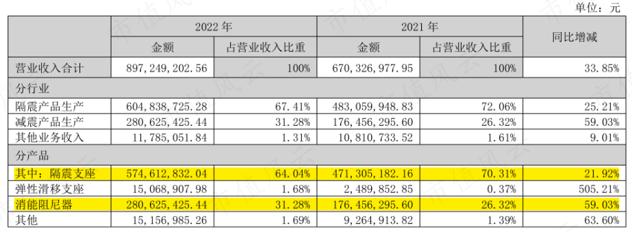 隔震支座和消能阻尼器是其营收的主要来源,2021、2022年合计占比均超过95%。