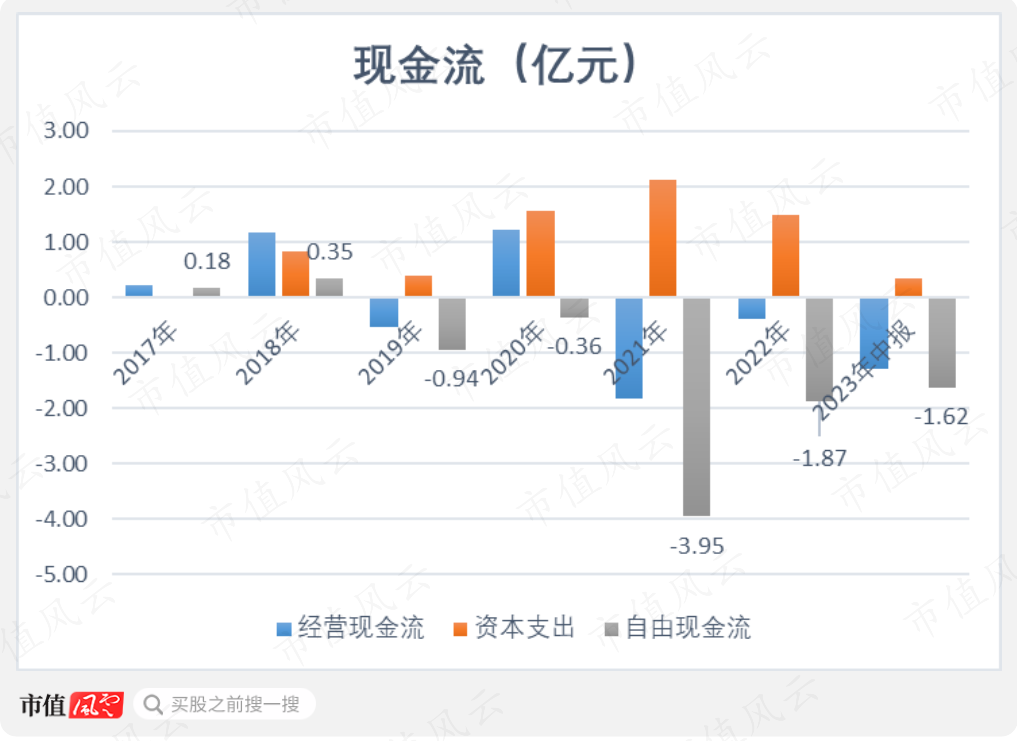 2019年开始,其经营活动净现金流就持续流出。加上产能扩建带来的资本支出需求,震安科技自由现金流自上市第一年起就为负,截至2023年中期合计净流出8.74亿。