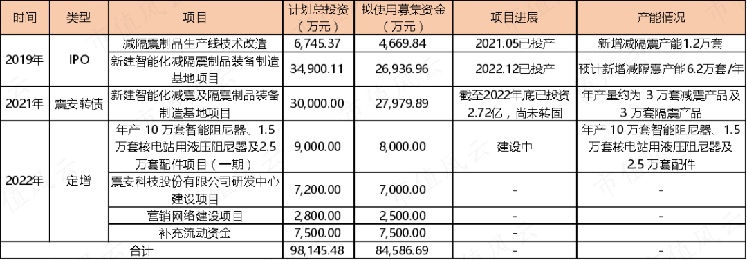 因此,震安科技需要不断的募资补血。2019年上市至2022年四年时间里,震安科技有过三次募资,金额合计9.19亿。