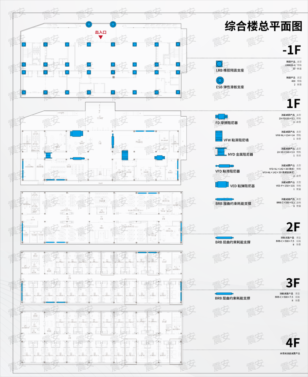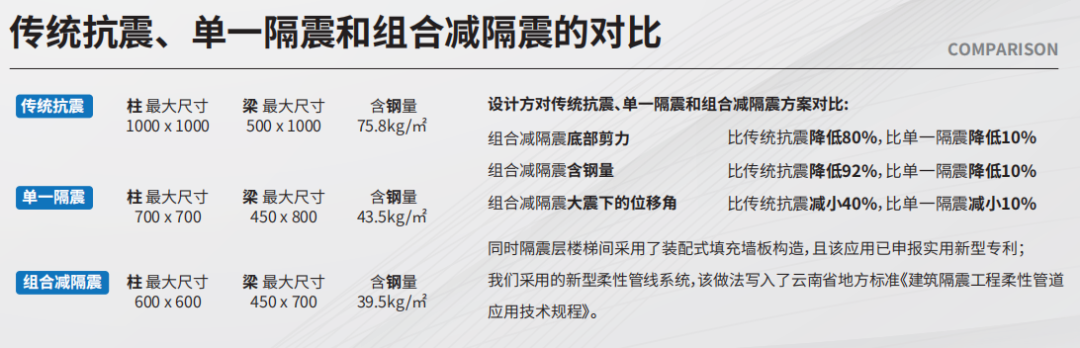 本项目组合减隔震技术代表性项目距,采用了下部隔震和上部多种阻尼器组合,多种支座和阻尼器优势互补、依次接力、共同承担,保证了结构在不同设防水准下均具有充足的耗能能力,显著提高了结构的抗震性能,并具备一定的经济性。