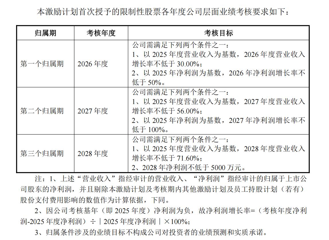 激励计划设置2026年至2028年三个归属期,公司层面业绩考核目标为:以2025年为基数,营业收入增长率分别不低于30%、56%、71.6%;或2026年、2027年净利润增长率不低于50%、100%,2028年净利润不低于5000万元。