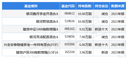 根据2021年报基金重仓股数据,重仓该股的基金共6家,其中持有数量最多的基金为银河鑫月享定开混合A。银河鑫月享定开混合A目前规模为1.76亿元,最新净值1.0168(3月22日),较上一日下跌0.01%,近一年上涨6.16%。该基金现任基金经理为刘铭石磊。石磊在任的公募基金包括:银河灵活配置混合A,管理时间为2019年4月22日至今,期间收益率为82.97%;银河君信混合A,管理时间为2019年7月5日至今,期间收益率为31.12%;银河臻优稳健配置混合A,管理时间为2021年11月5日至今,期间收益率为-1.18%。刘铭在任的公募基金包括:银河君尚混合A,管理时间为2017年4月29日至今,期间收益率为60.12%;银河君信混合A,管理时间为2017年4月29日至今,期间收益率为48.61%;银河君荣灵活配置混合A,管理时间为2017年4月29日至今,期间收益率为84.48%;银河君耀混合A,管理时间为2017年4月29日至今,期间收益率为67.64%。