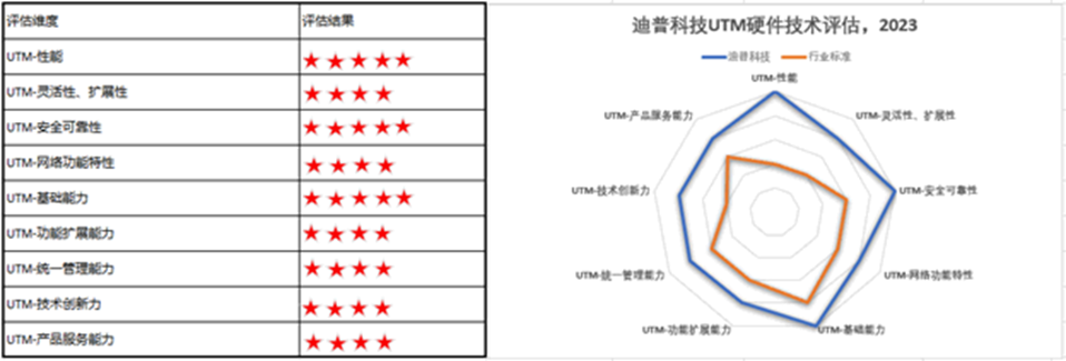 近期,权威机构IDC发布《IDC Technology Assessment:中国统一威胁管理硬件技术评估,2023》报告,该报告从统一威胁管理硬件产品的性能、灵活性、扩展性、安全可靠性、网络功能特性、基础功能、扩展功能、统一管理能力、技术创新力,产品服务能力9个维度对主要产品技术服务提供商的技术能力进行评估。迪普科技防火墙在性能、安全可靠性、基础能力上获得五星级评价,其余各项均领先于行业标准。