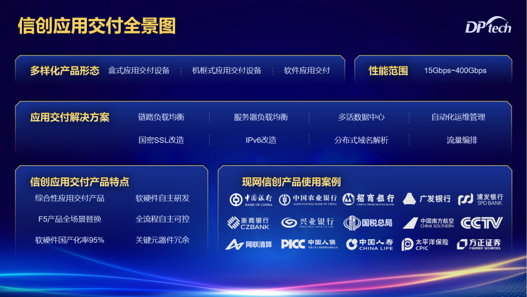 迪普科技的应用交付产品具备服务器负载、链路负载、全局负载、DNS、SSL加解密流量编排等多种能力,从多场景进行业务流量的处理及交付。全线产品采用可扩展性的分布式业务处理设计架构,在大大提升系统的整体处理能力的同时,加强了系统整体的稳定性,同时具备国产化替换能力,设备软硬件国产化率达到了95%以上。