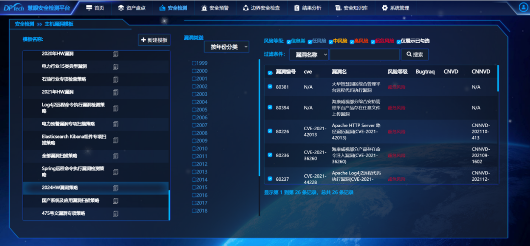 主机漏洞扫描新增2024HW漏洞策略模板,可以针对漏洞不同类别、风险等级以及来源于CNVD或者CNNVD进行判别。