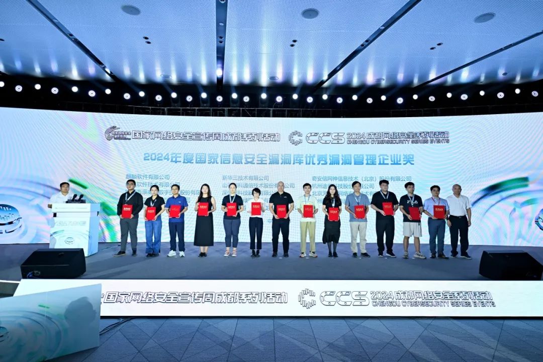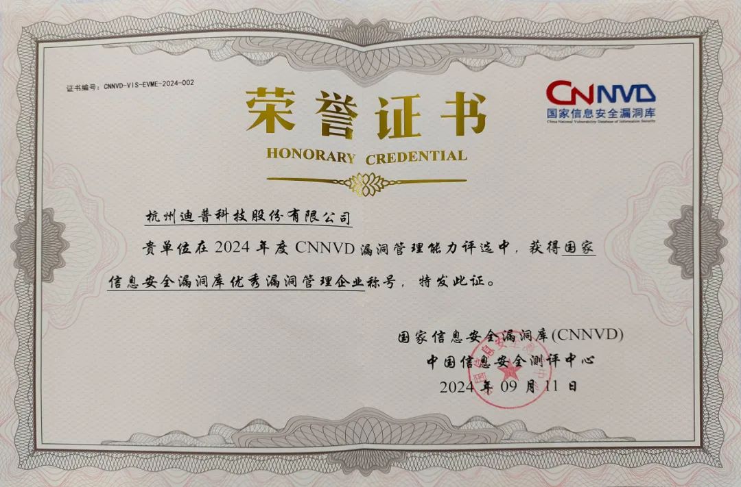 9月11日-12日,CCS 2024成都网络安全系列活动在成都举行,作为2024年国家网络安全宣传周成都系列活动的重磅活动之一,迪普科技受邀参加此次活动,并在开幕式当天同步举行的国家漏洞库(CNNVD)网络安全漏洞治理产业协同创新研讨活动中,经多轮评选最终获评“国家信息安全漏洞库优秀漏洞管理企业”。