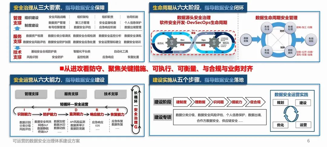 迪普科技《可运营的数据安全治理体系建设方案》以“3665”的数据安全治理体系架构为基础,包含了治理所需达成的目标,贯穿了治理维度、治理体系、实施路径以及数据安全运营,提供了映射于GIPDRR框架的关键控制措施的量化指标,采用基于AI 驱动的数据安全自动化工具与平台,可满足不同用户在不同阶段对数据安全治理的需求,针对企业数据安全治理体系不同阶段落地实施,提供整体安全运营能力资源保障。