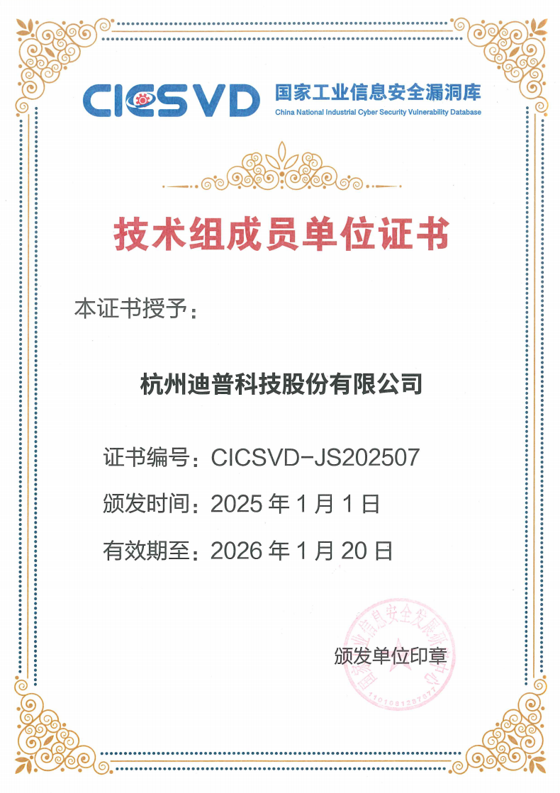 自2020年加入CICSVD以来,迪普科技一直积极参与CICSVD的技术研究与漏洞治理工作,与行业伙伴携手,共同推动工业信息安全漏洞的发现、分析与修复,助力国家关键信息基础设施的安全防护能力提升。未来,迪普科技将继续深耕工业信息安全领域,以技术创新为驱动,为行业客户提供更优质的安全产品与服务,为国家工业信息安全建设贡献力量。