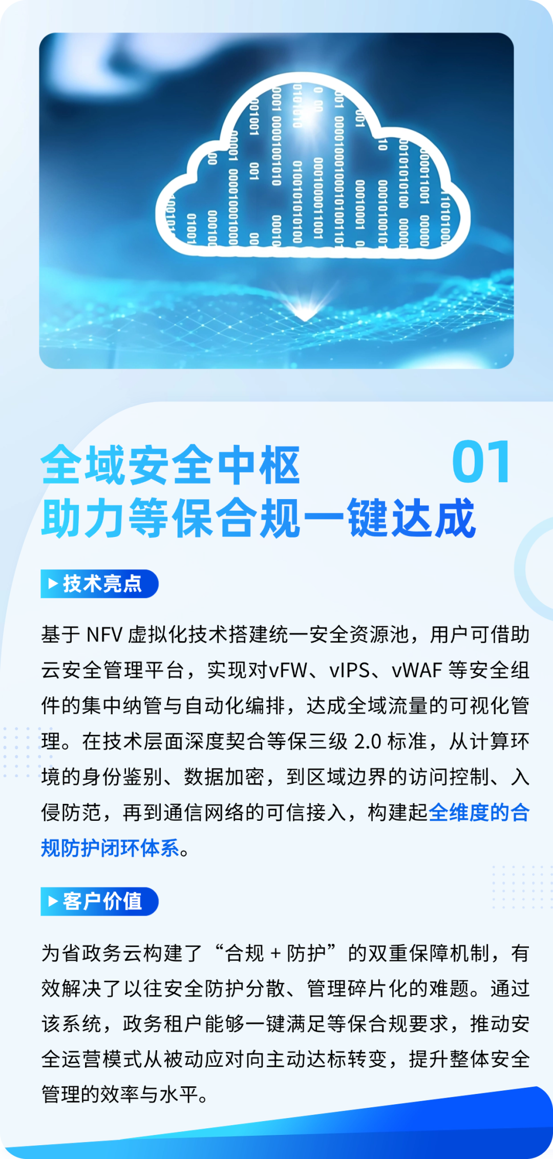 省政务云作为支撑全省数字政府高效运行与“一网通办”“一网统管”的核心基础设施,肩负着保障政务服务连续性、数据安全共享及跨部门协同的关键使命。面对国家《“十四五”规划》对政务系统安全可靠应用及国产化替代的要求,以及原有边界安全防护措施无法满足云内多租户场景下的业务访问隔离及安全需求,省政务云迫切需要构建一套更为完备、专业、自主可控的云安全防护机制,迪普科技云安全解决方案通过打造符合等保2.0三级标准的纵深防御体系,为某省政务云“便民服务”、“一体化政务服务平台”等品牌应用提供可信赖的安全基座,并形成全省可复用的信创安全实践范本。