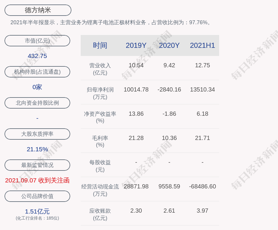 2021年半年报显示,德方纳米的主营业务为锂离子电池正极材料业务,占营收比例为:97.76%。
