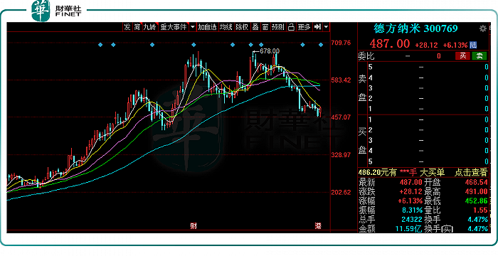 2022年1月6日,德方纳米大涨6.13%,股价487元,目前最新总市值为434.5亿元。