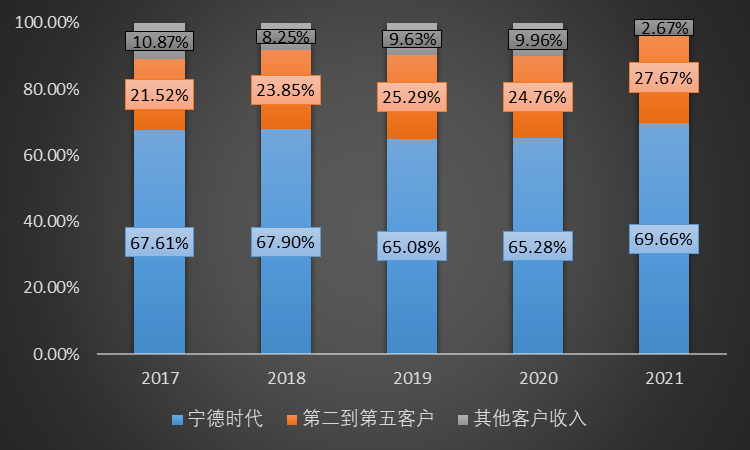德方纳米近年的快速发展与其采取的深度绑定动力电池大客户的策略分不开,公司主要客户包括宁德时代、比亚迪和亿纬锂能等头部动力电池厂商。公司对前五大客户的销售额占其营收的比例长期在90%以上,2021年更是达到了97.33%,其中,宁德时代长期作为德方纳米的第一大客户,公司对其销售收入占营收的比例长期在60%以上。