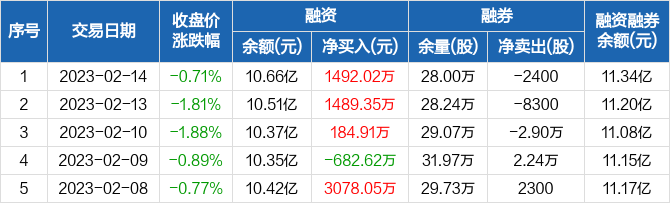 融资方面,当日融资买入4374.89万元,融资偿还2882.87万元,融资净买入1492.02万元,连续3日净买入累计3166.28万元。融券方面,融券卖出4000股,融券偿还6400股,融券余量28万股,融券余额6721.03万元。融资融券余额合计11.34亿元。