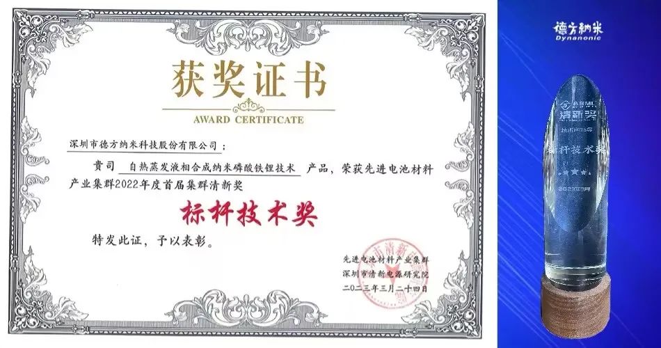 德方纳米独创的“自热蒸发液相合成纳米磷酸铁锂技术”,荣获此次“清新标杆技术奖”