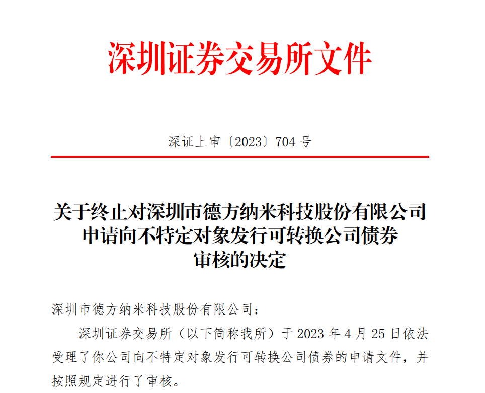 乐居财经李兰 12月7日,深交所决定终止对深圳市德方纳米科技股份有限公司(以下简称“德方纳米”)申请向不特定对象发行可转换公司债券的审核。12月4日,德方纳米提交撤回申请,深交所终止审核其发行可转债事项。