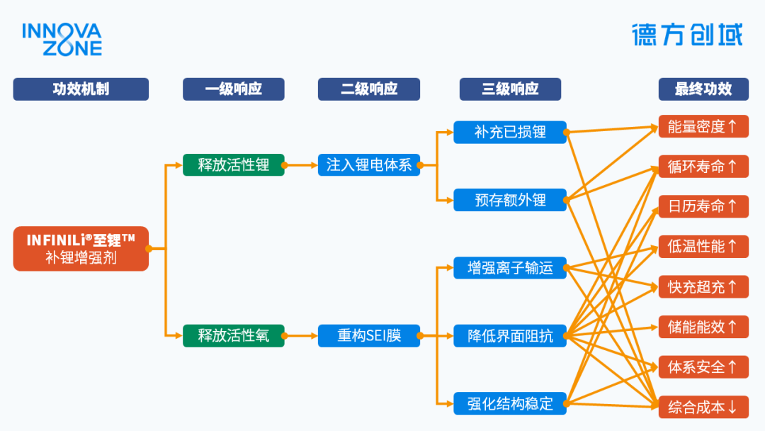 INFINILi?至锂?补锂增强剂通过在电池首次充放电过程中释放活性锂,显著补偿锂电池在早期循环中的活性锂损失,并预存额外锂;同时释放活性氧重构SEI膜,从而增强离子输运、降低界面阻抗、强化结构稳定;该补锂方式通过三级作用和响应,最终极大地提升了电池的能量密度,使其在保证安全性和兼顾经济成本的同时,显著提高电池的循环性能及低温、快充等电化学动力学性能。