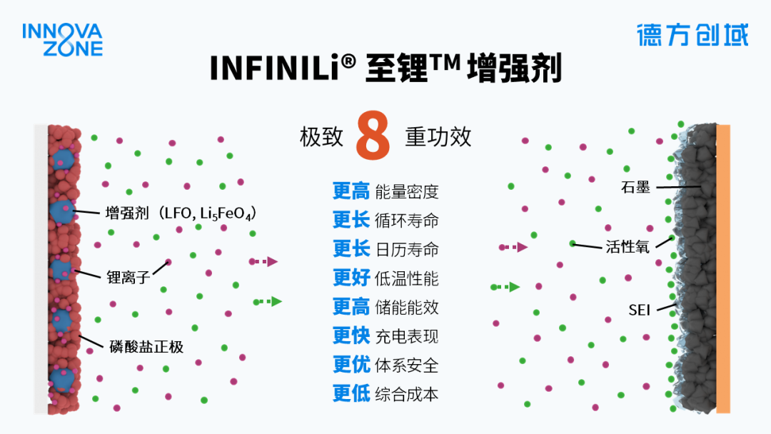 INFINILi?至锂?补锂增强剂是公司近年来推出的核心新材料产品,由德方纳米子公司深圳市德方创域新能源科技有限公司(下称“德方创域”)主导开发,能为电池体系提供极致的性能提升,具有“点石成金”的特点,被称为锂电“强芯剂”。