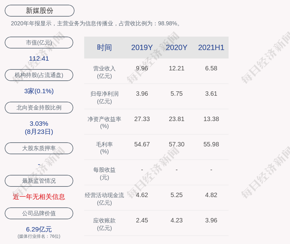 2020年年报显示,新媒股份的主营业务为信息传播业,占营收比例为:98.98%。
