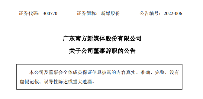 公告指出,新媒股份董事会于近日收到非独立董事鲍宇先生、雷霞女士的书面辞职报告。