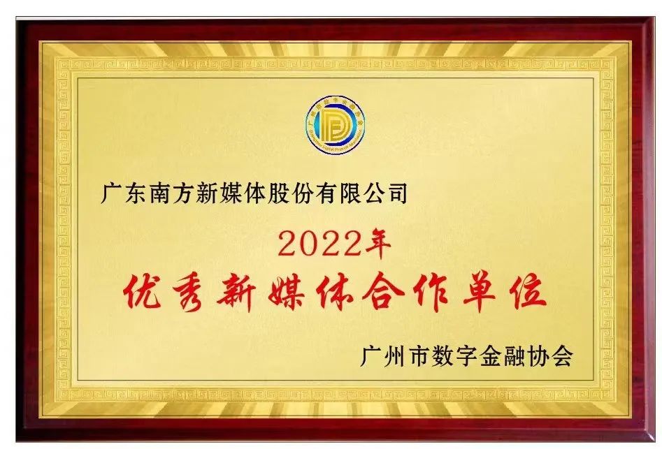 2022年11月17日,我司荣获广州市数字金融协会颁发的“2022年优秀新媒体合作单位”荣誉称号。