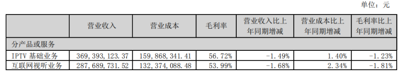 互联网电视业务方面。报告期内,持续加强云视听极光、云视听小电视两大核心产品的精细化运营,不断提升会员权益和观看体验;布局电竞、K歌、短视频等垂类产品,丰富内容产品形态,打造视、听、唱、玩多元互联网电视产品矩阵;稳步推进与行业主流终端厂商的智能终端业务合作,逐步构建“内容+平台+终端”的运营闭环。报告期内,积极应对外部经济大环境、行业监管、行业规范化发展等综合因素的影响,截至2023年6月末,其公司云视听系列APP全国有效用户达到2.49亿户,同比增长0.81%;服务的有效智能终端数量达到2003万台,同比增长30.83%。