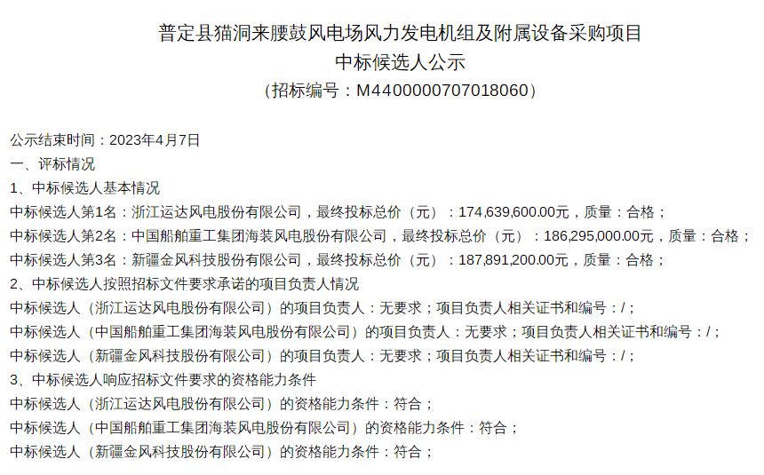 中国风电新闻网讯:近日,普定县猫洞来腰鼓风电场风力发电机组及附属设备采购项目中标候选人公示,规模共计100MW,运达股份预中标,投标报价1.75亿元。