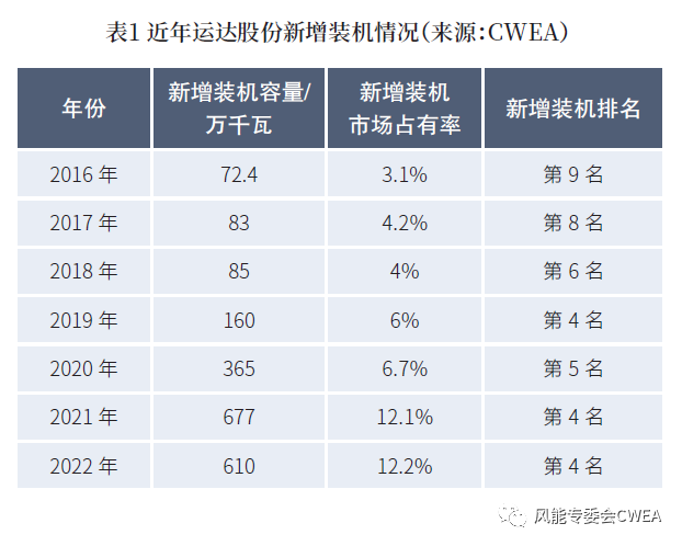 中国可再生能源学会风能专业委员会(CWEA)的数据显示,2018年及此前几年,运达股份的新增装机容量徘徊在百万千瓦以下,新增装机市场占有率约为4%。从2019年开始,其新增装机容量与市场占有率快速提升,到2022年市场占有率已达12.2%,新增装机排名稳居第四,并正冲击第一梯队。其中,运达股份的陆上风电新增装机容量已进入市场前三。