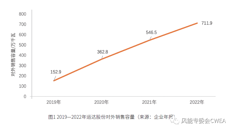 自此,运达股份开启了强劲的发展势头,在风电整机市场大量获取订单。运达股份的2019―2022年年报显示,该公司用4年时间,将整机年度对外销售容量从152.9万千瓦提升至711.9万千瓦。