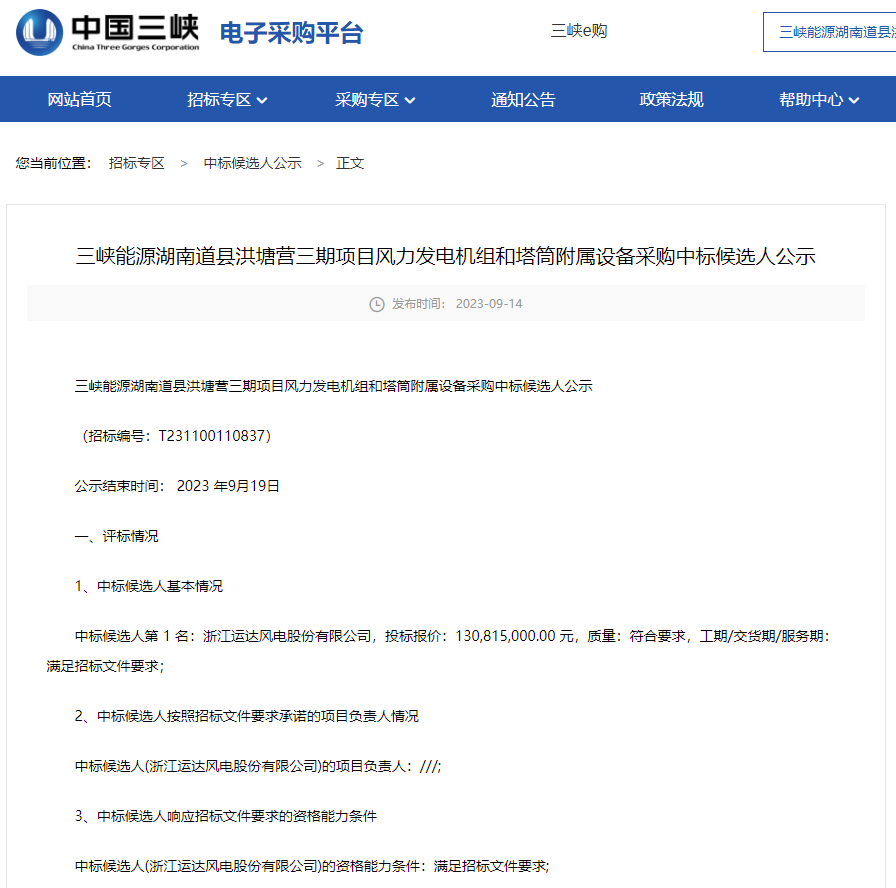 9月14日,三峡能源湖南道县洪塘营三期项目风力发电机组和塔筒附属设备采购中标候选人公示,规模共计67.5MW,运达股份预中标,投标报价13081.5万元。