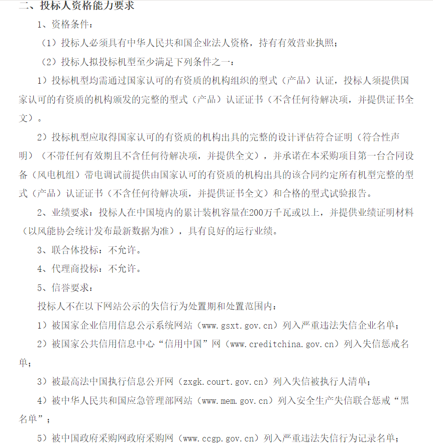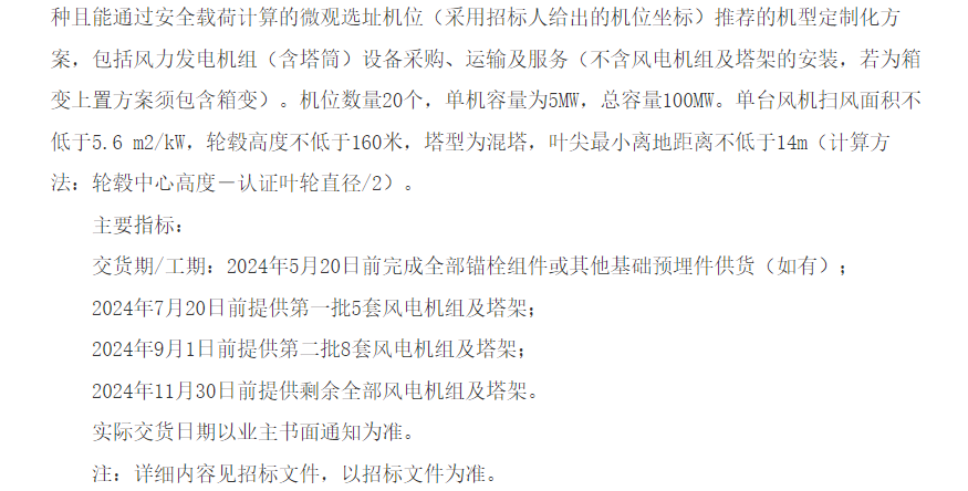招标公告显示,华润饶阳100兆瓦保障性风电场项目位于河北省衡水市饶阳县大官亭镇、大尹村镇等镇;总容量为100MW;要求单机容量为5MW。