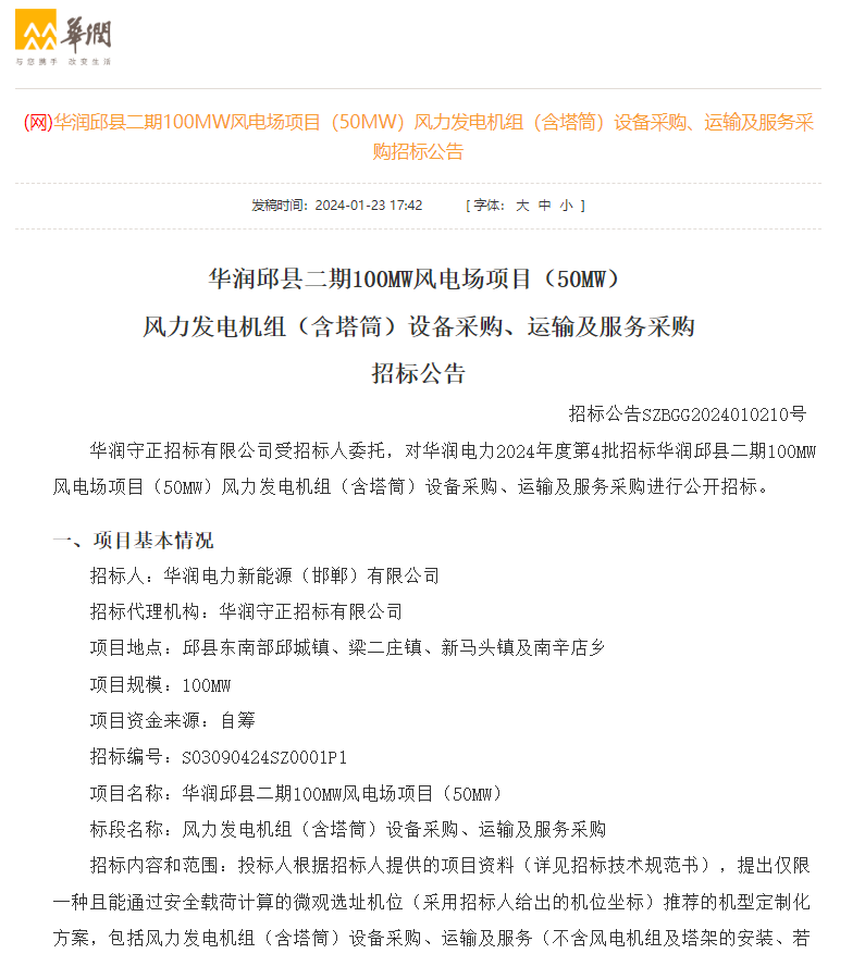 风芒能源获悉,3月4日,华润邱县二期100MW风电场项目(50MW)、华润饶阳100兆瓦保障性风电场项目、华润阜城50兆瓦市场化风电场项目风力发电机组(含塔筒)设备采购、运输及服务采购中标候选公示。